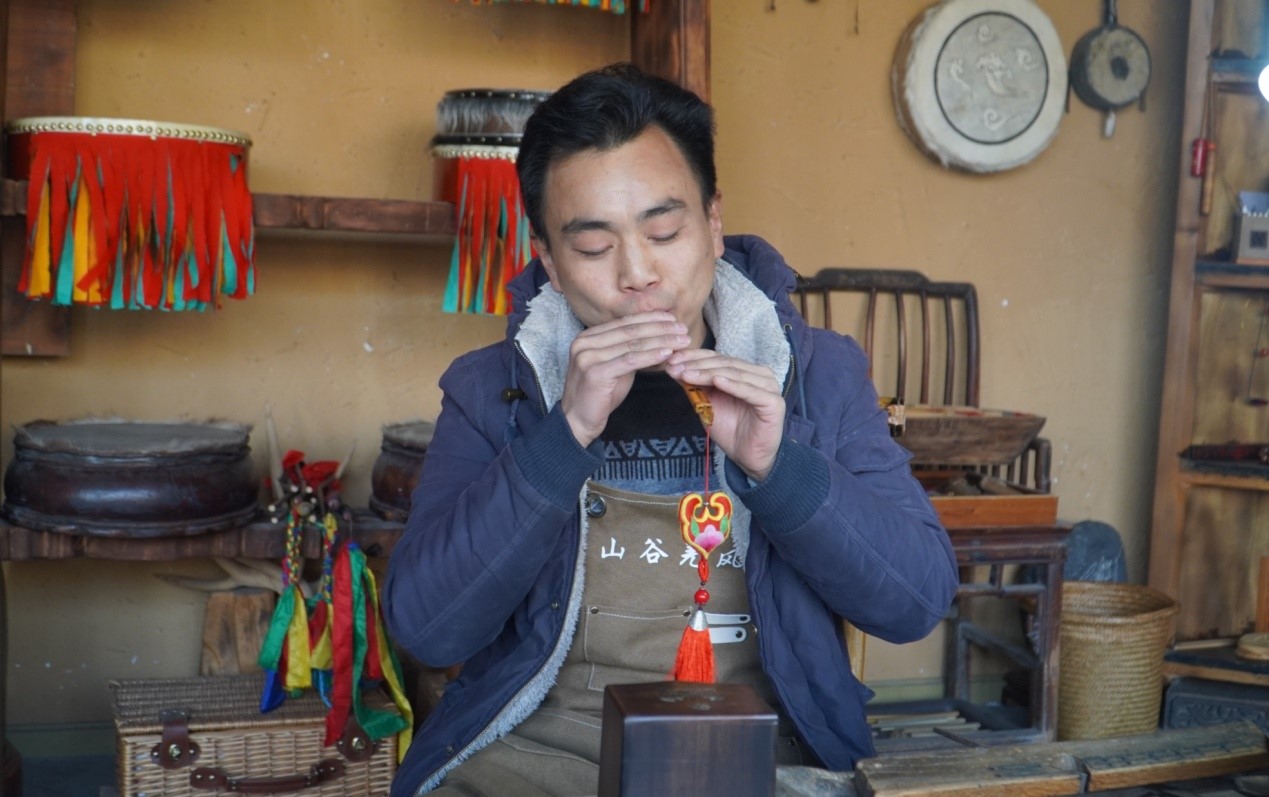 Zhao Kun, an inheritor of Qiang flute performance and making techniques, plays the instrument. (China National Radio/Chang Sirong)