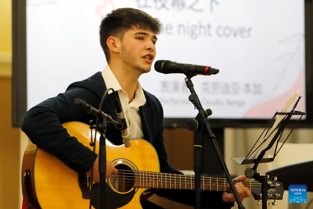 A student choir performs during an event organized by Confucius Institute of Transilvania University of Brasov to mark the UN Chinese Language Day in Brasov, central Romania, April 19, 2024. (Photo by Cristian Cristel/Xinhua)