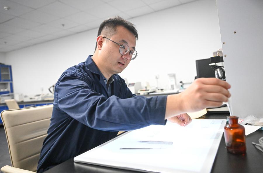 Gao Xuemiao measures the value of paper fibers at the laboratory of Tianjin Library in north China's Tianjin Municipality, April 18, 2024. (Xinhua/Sun Fanyue)