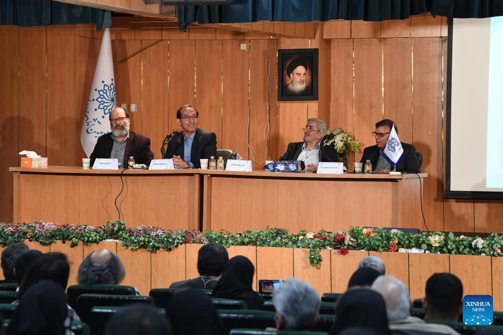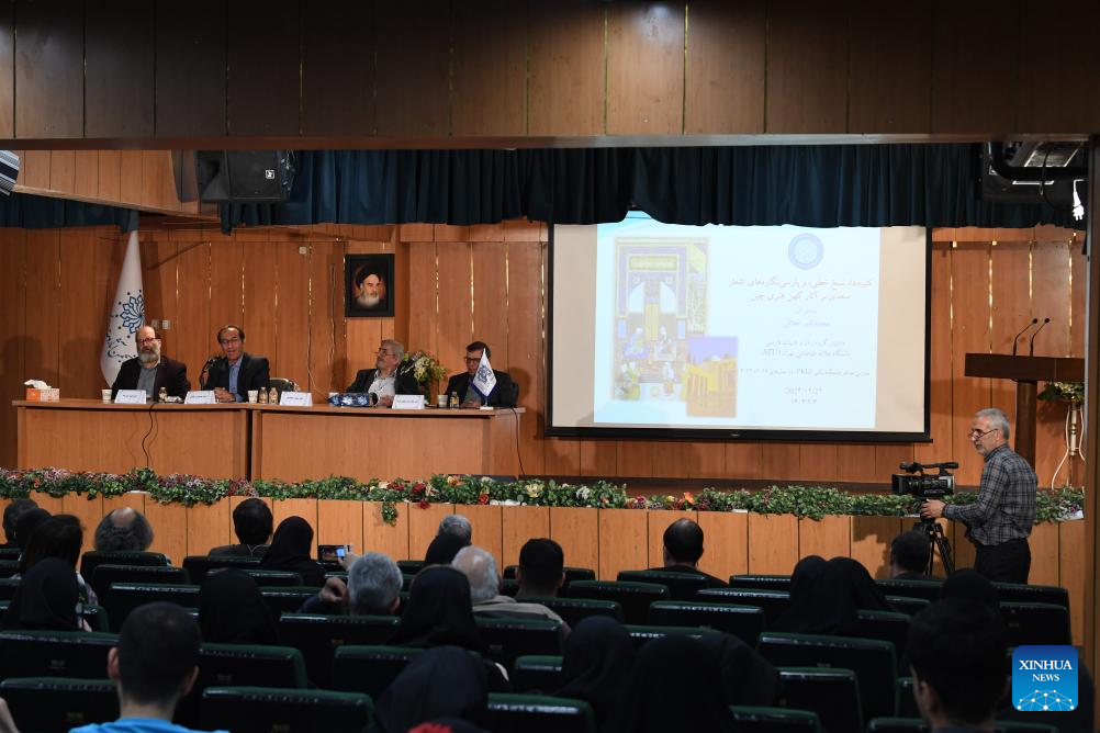 Mohammad-Amir Jalali (R), president of the Center for Chinese Research at Iran's Allameh Tabataba'i University, speaks at a conference to commemorate the prominent Iranian poet and prose writer Saadi Shirazi in Tehran, Iran, on April 22, 2024. Iranian experts have highlighted the significant role culture can play in contributing to the development of Iran-China relations in various fields. (Xinhua/Shadati)