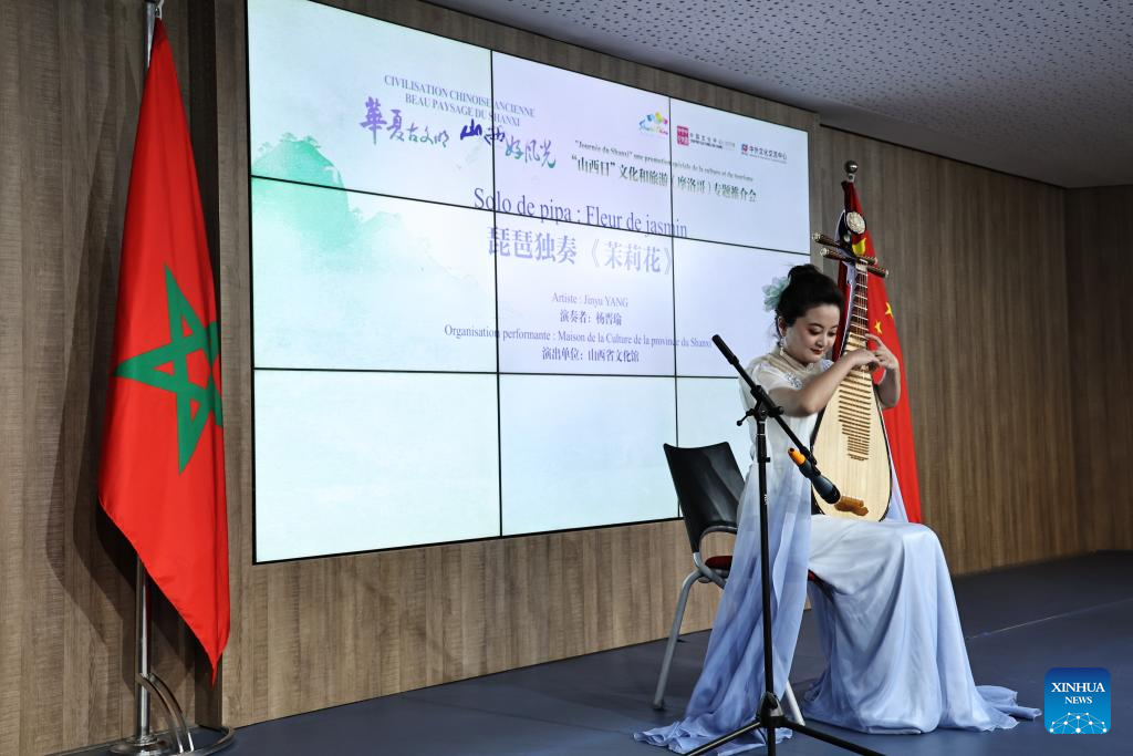 An artist plays Chinese music piece "Jasmine Flower" during an event that promotes culture and tourism of north China's Shanxi Province in Rabat, Morocco, April 22, 2024. The event was held here on Monday to showcase Shanxi Province to the Moroccan public, where artists from Shanxi showcased intangible cultural heritage works such as paper-cutting and dough sculpture. (Xinhua/Huo Jing)