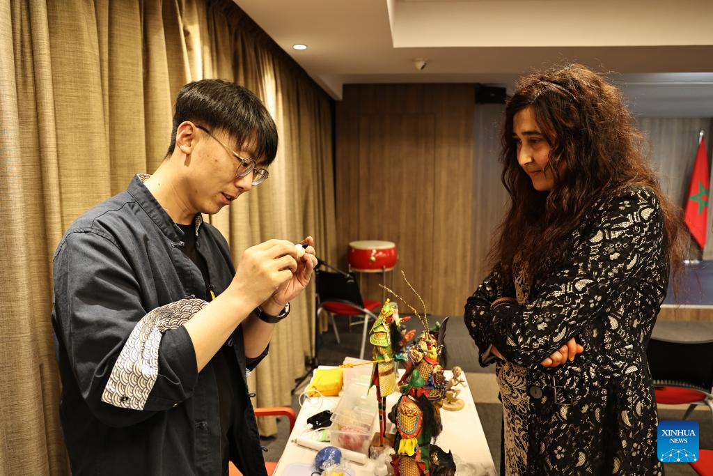 An artist demonstrates dough modelling during an event that promotes culture and tourism of north China's Shanxi Province in Rabat, Morocco, April 22, 2024. The event was held here on Monday to showcase Shanxi Province to the Moroccan public, where artists from Shanxi showcased intangible cultural heritage works such as paper-cutting and dough sculpture. (Xinhua/Huo Jing)