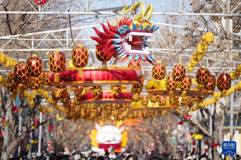 観光客がハルビン中央大街で龍の飾り燈ろうを観賞した。新華社記者?王建威撮影