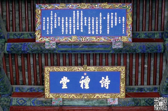 圣人遺風今猶在,禮門義路家規矩。在曲阜孔廟東路承圣門后面有始建于宋代的“詩禮堂”,明弘治時為了紀念孔子教育兒子孔鯉“學詩學禮”而命名。清康熙、乾隆來曲阜祭祀時在這里聽孔子后裔講經,乾隆還題寫“則古稱先”“詩書禮樂”的匾額和對聯,贊譽孔子及其家風。