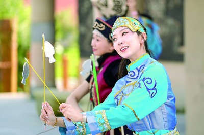 2022年9月4日,在黑龍江省撫遠市烏蘇鎮(zhèn)抓吉赫哲族村,赫哲族姑娘在表演民族舞蹈