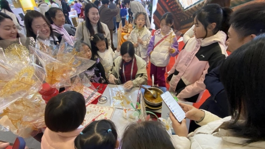多位非遺傳承人現場表演技藝,也把展廳氛圍推得更上層樓。山東省泰安市寧陽縣李氏糖畫第六代傳承人李然然帶著她的“甜蜜”作品來到現場。一鍋、一勺、一鏟、一點糖,就繪制出了壯美山東、和美生活。“簡直是藝術品!”“憑本事吃飯!”“這誰舍得吃啊!”現場驚嘆聲此起彼伏。
