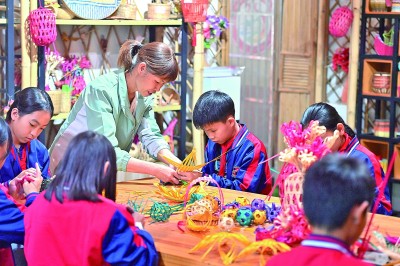 11月28日,在廣西岑溪市南渡中心小學,老師在指導小學生練習當地非遺項目——竹芒編織技藝。新華社發
