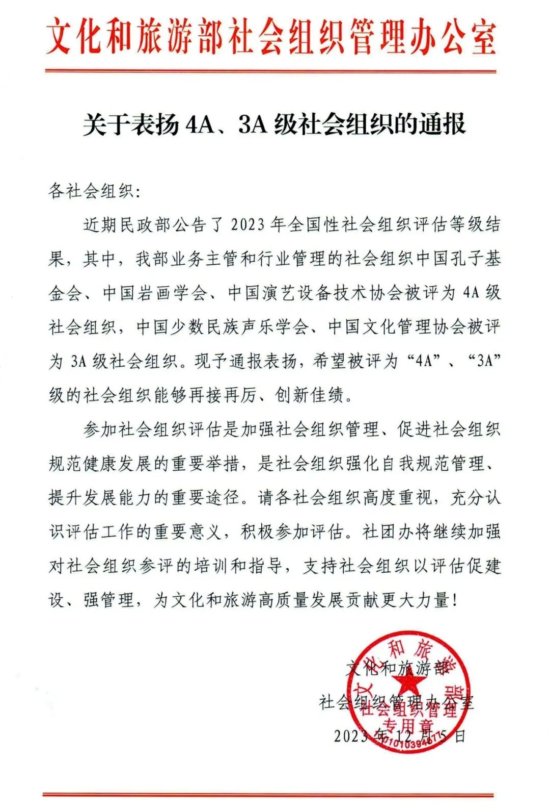 文旅部通報表揚中國孔子基金會獲評全國性4A級社會組織