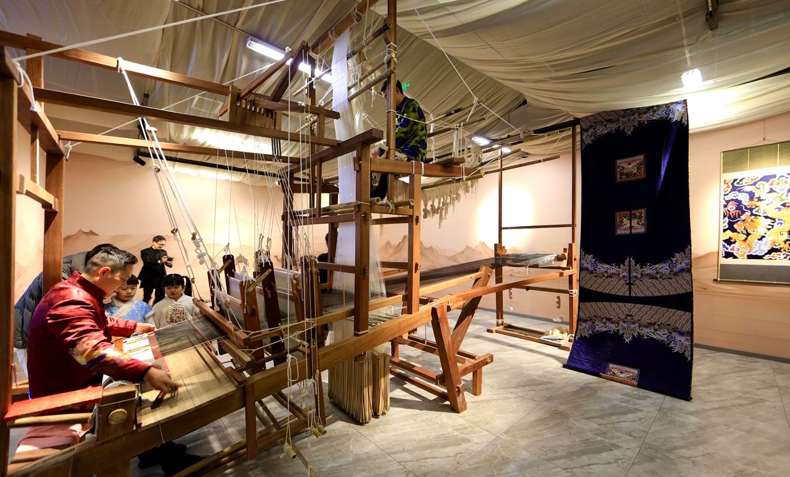 云錦大花樓木織機手工織造現場演示。(圖文:侯新建)