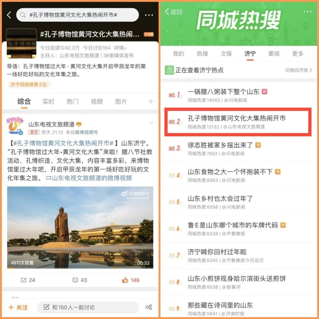 孔子博物館與山東文旅頻道聯(lián)合舉辦的“孔子博物館過大年·黃河文化大集”系列活動,作為山東電視文旅頻道“2024尋年味 趕大集”系列慢直播的首站,通過人民日報、央視頻、黨媒平臺、抖音、快手等十多個網(wǎng)絡平臺同步直播,全網(wǎng)收看量破2300萬,微博話題#孔子博物館黃河文化大集熱鬧開市#登上濟寧同城熱搜榜第2位。網(wǎng)友們可以通過線上線下多種形式,來博物館里過大年,體驗濃濃的“中國年味”,感受難以割舍的故鄉(xiāng)情懷。
