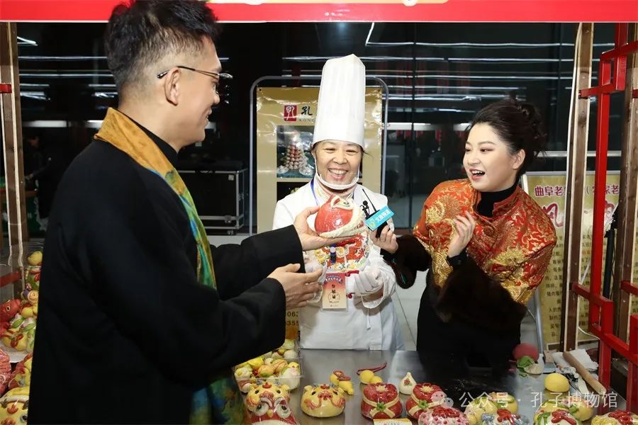 在“孔子博物館過大年·黃河文化大集”系列活動中,趕大集,美食必不可少。在北方,臘月二十八,開始蒸過年吃的面食,被稱之為“蒸壯”。孔府花饃是一種極具代表性的北方面食,花糕、年糕、饃饃、花卷、糖包子、豆包子......花樣精美,且都具有美好寓意。除此之外,“黃河文化大集”上還有臘味、鹵味、糖葫蘆味兒......摻雜在一起,匯合成大家最期待的幸福“年味”。線上的觀眾朋友們在通過直播“一探究竟”的同時,也可以親臨集市現(xiàn)場大飽口福。