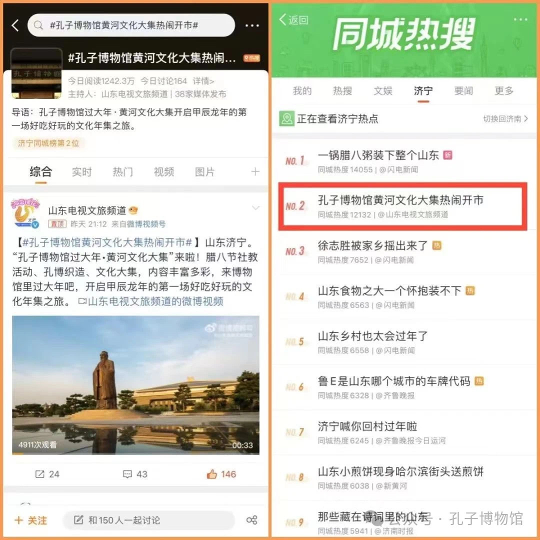 農歷大年初三,央視新聞聯播頭條“中國文化中國年”對孔子博物館進行了特別報道。“孔子博物館過大年·黃河文化大集”系列活動通過人民日報、央視頻、黨媒平臺、抖音、快手等十多個網絡平臺同步直播,全網收看量破2300萬,網友們通過線上觀看直播的方式,來博物館里過大年,體驗濃濃的“中國年味”,感受難以割舍的故鄉情懷。春節期間,“黃河文化大集”,“龍行中華——甲辰龍年生肖文物大聯展”、“六合同春——孔府過大年文物展”等頻上熱搜。孔子博物館官方微博、微信公眾號、今日頭條、抖音等平臺結合熱點話題,制作發布宣傳圖文通稿70余篇,攝制短視頻25個,保持宣傳熱度持續高漲,吸引海內外觀眾到館參觀體驗。
