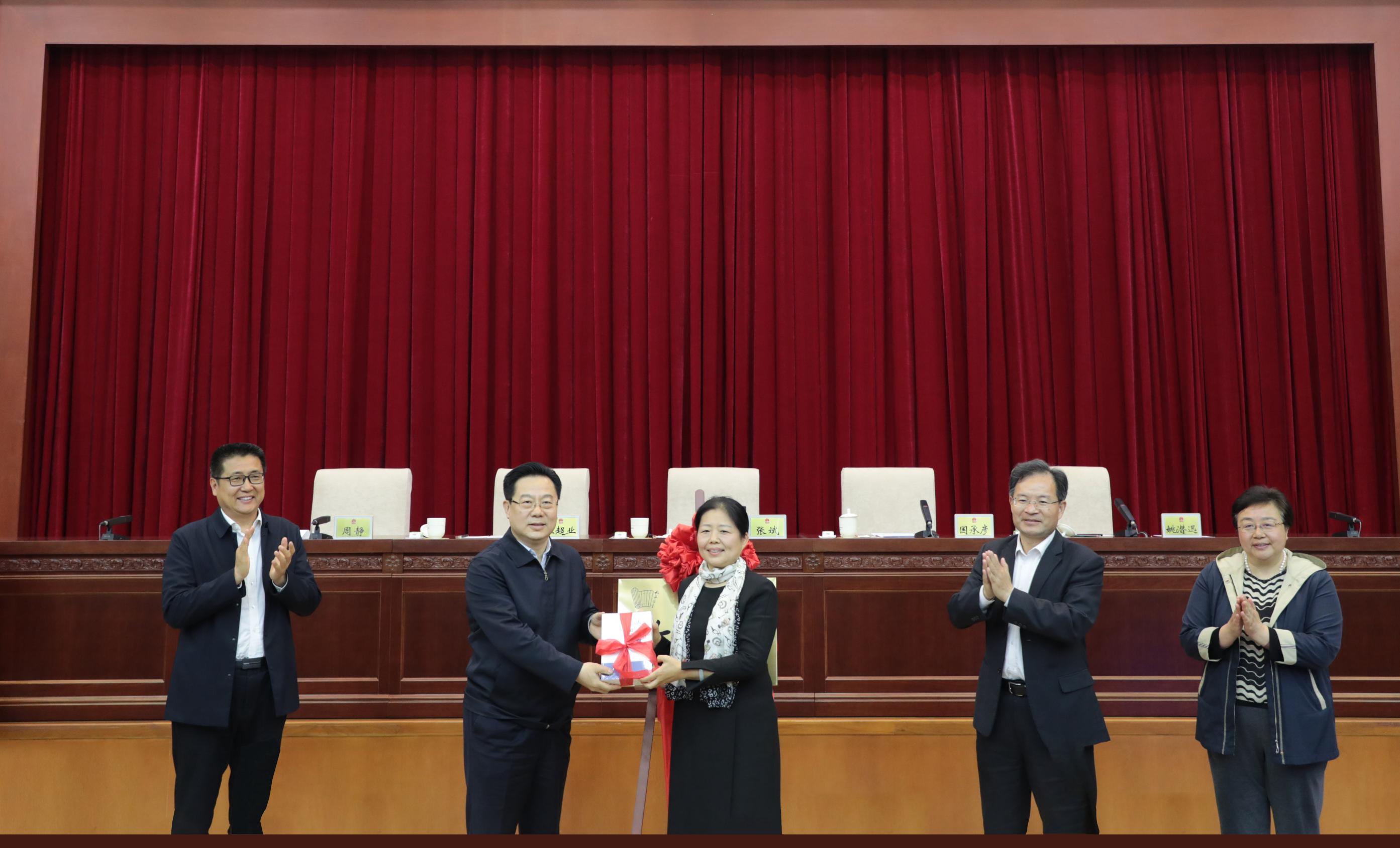 國承彥、張斌、姚潛迅、周靜、王超業共同為省人大機關孔子學堂揭牌,國承彥代表尼山世界儒學中心(中國孔子基金會秘書處)向省人大常委會機關贈送傳統文化叢書。