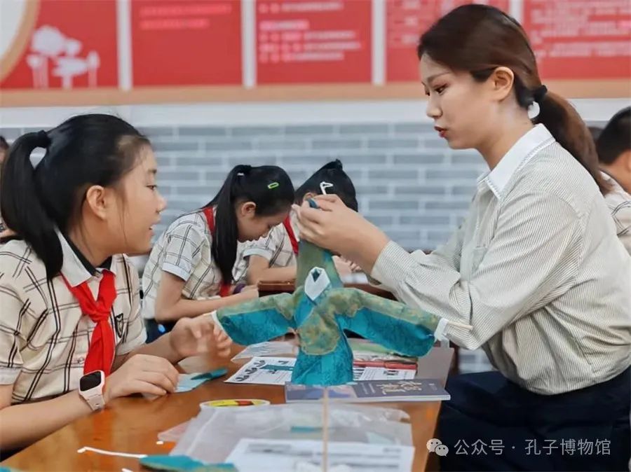 展覽現場,學生同步體驗 “衣冠載道”孔府舊藏服飾研學手作實踐課程,通過剪裁、拼貼、還原復刻經典明制服裝精品的過程,感受傳統明制服飾的款式、形制、紋樣、工藝之美。