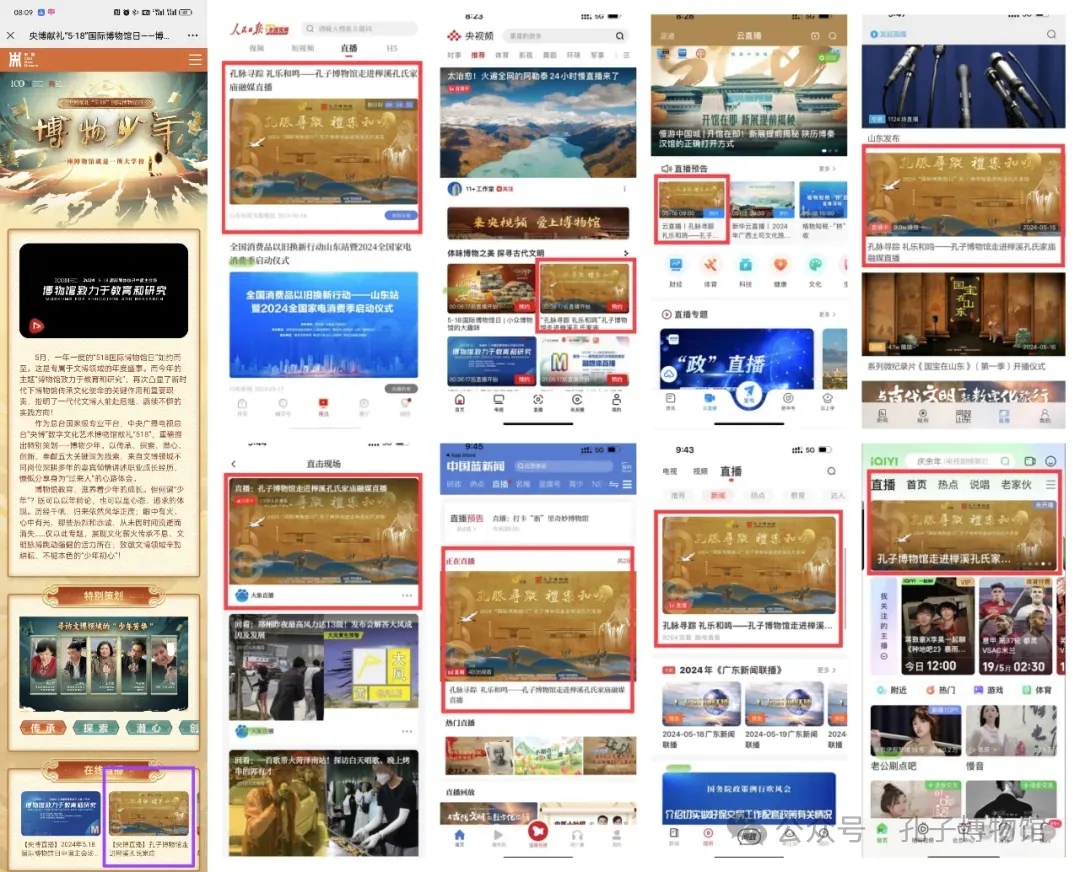 “孔脈尋蹤 禮樂和鳴”——孔子博物館走進櫸溪孔氏家廟融媒直播,通過全國黨媒平臺、人民日報、央視頻、新華網、文旅中國、央博數字平臺、孔子網、閃電新聞、大象新聞、中國藍新聞客戶端、觸電新聞、虎牙直播、愛奇藝、全國電視旅游聯盟、孔子博物館新媒體矩陣、山東電視文旅頻道新媒體矩陣等近40個網絡平臺同步收看直播,全網收看量2526.6萬。同時直播還被全國黨媒平臺、央視頻、新華網、央博數字平臺、閃電新聞、大象新聞、中國藍、觸電新聞、愛奇藝等首頁大圖推薦。