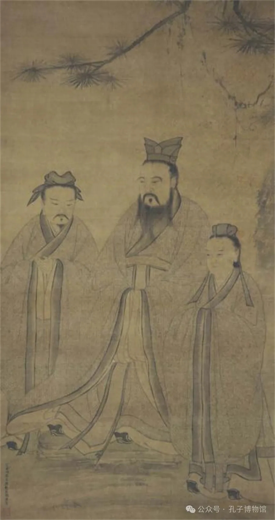 圖中繪有至圣孔子、復圣顏回、宗圣曾參三位先哲。孔子居中,禮冠、寬衣、博帶、烏履,長須下垂,神態安詳,展現出謙卑有禮、雍容大度的圣人風范。弟子顏回侍立其左側,曾參侍立其右側,均頭戴巾幘,著交領大袖長衣,恭敬侍立傾聽孔子教誨,神態安詳,文質彬彬。三人衣紋和服飾均由蠅頭小楷《論語》書成。