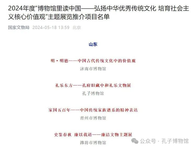 《禮樂東方——孔府舊藏中和禮樂文物展》入選“博物館里讀中國——弘揚中華優(yōu)秀傳統(tǒng)文化 培育社會主義核心價值觀”主題展覽推介項目