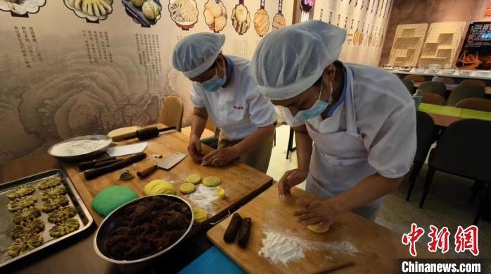 隆盛糕點技藝傳習所工作人員正展示制作技法。周藝偉 攝