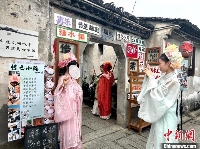 女子在老街區(qū)體驗(yàn)漢服簪花。項(xiàng)菁 攝