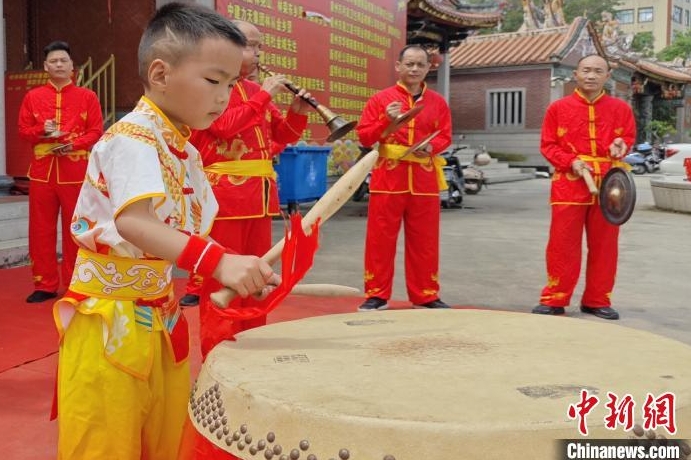 14日,年僅7歲的林嘉銘代替爺爺上陣打大鼓?!枪跇?biāo) 攝