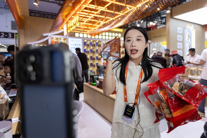 2024年5月13日,在上海舉辦的中國品牌博覽會上,一名工作人員在中華老字號“新寶堂”展位直播帶貨。新華社記者 王翔 攝