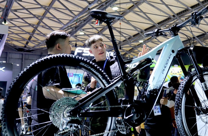 2024年5月5日,第32屆中國國際自行車展覽會在上海新國際博覽中心開幕,參觀者在鳳凰自行車展臺上一輛電助力自行車旁交流討論。新華社記者 方喆 攝