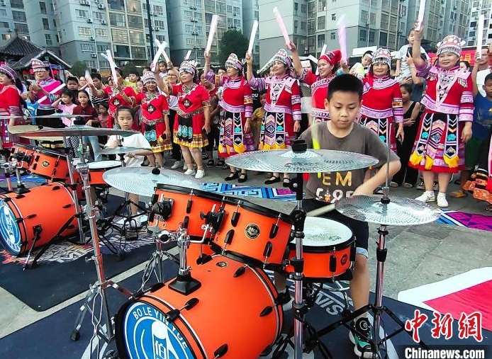 7月3日至4日,廣西大化瑤族自治縣舉辦2024年“祝著節(jié)”慶?;顒?。圖為10歲的韋榮樂(右)在用架子鼓演奏《霍元甲》?!≈行律缬浾?黃艷梅 攝