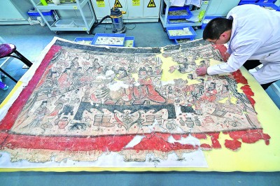 工作人員在云岡研究院壁畫文物修復室進行壁畫修復。新華社記者詹彥攝