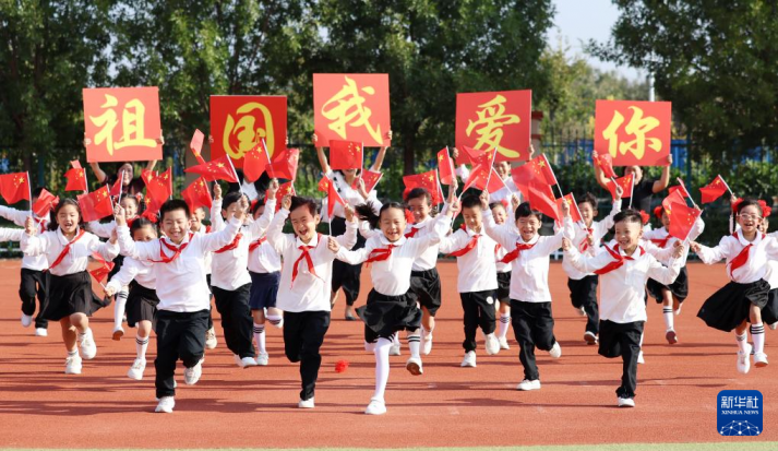 山東郯城縣第一實驗小學學生手持國旗快樂奔跑,喜迎國慶節的到來。