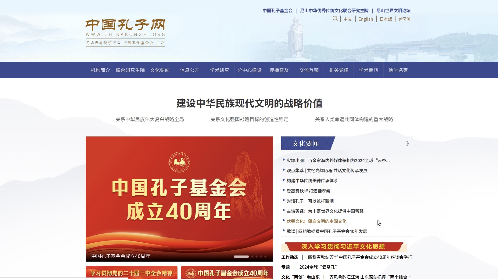 尼山世界儒學中心、中國孔子基金會共同主辦的傳播平臺,形成了網站、APP、微信、微博、自媒體號等全方位的融媒體格局,成為弘揚儒家思想、齊魯文化和中華文化的重要窗口。2017年,在“文傳榜·2016”中國文化網絡傳播系列征集發布活動上,榮膺中國“十大國學網站”之首。