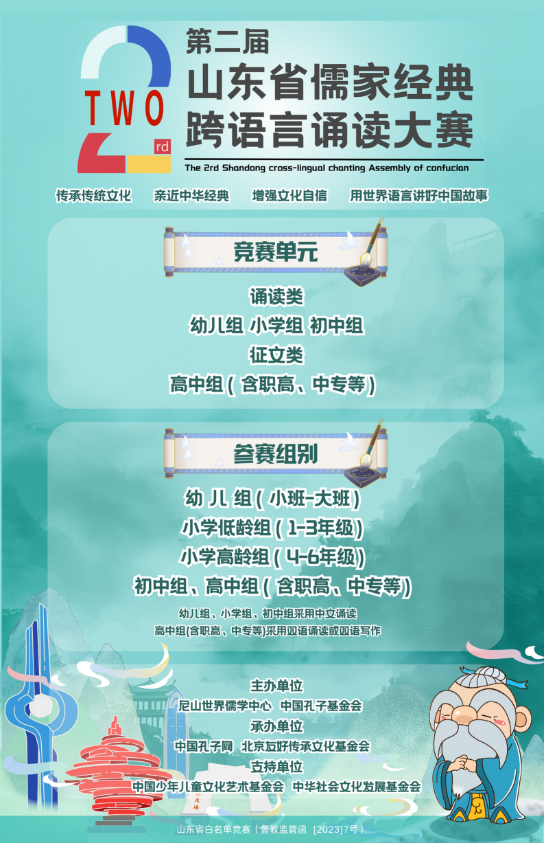 為深入學習貫徹習近平文化思想,堅定文化自信,賡續中華文脈,引領青少年深入學習中華經典,推動中華優秀傳統文化創造性轉化、創新性發展。根據《山東省教育廳關于公布面向中小學生的全省性競賽活動名單(2023-2025年)和全國性競賽活動在山東省備案通過名單的通知》(魯教監管函〔2023〕7號)要求,尼山世界儒學中心、中國孔子基金會舉辦第二屆山東省儒家經典跨語言誦讀大賽,并制定如下方案。