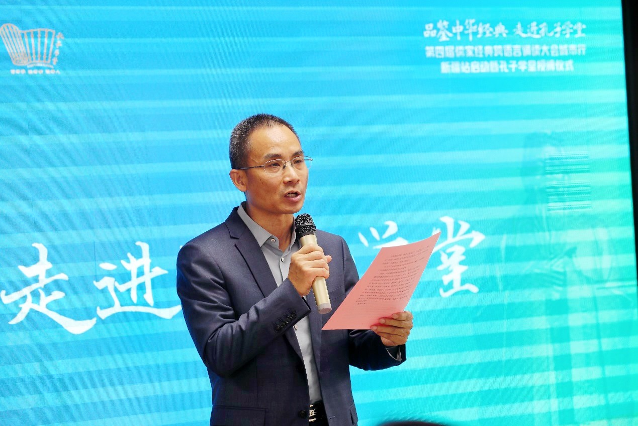 中國孔子網副主編楊光向與會嘉賓做了第四屆儒家經典跨語言誦讀大會項目推介,并向書香天山科技有限公司孔子學堂頒發大會公益支持單位證書。