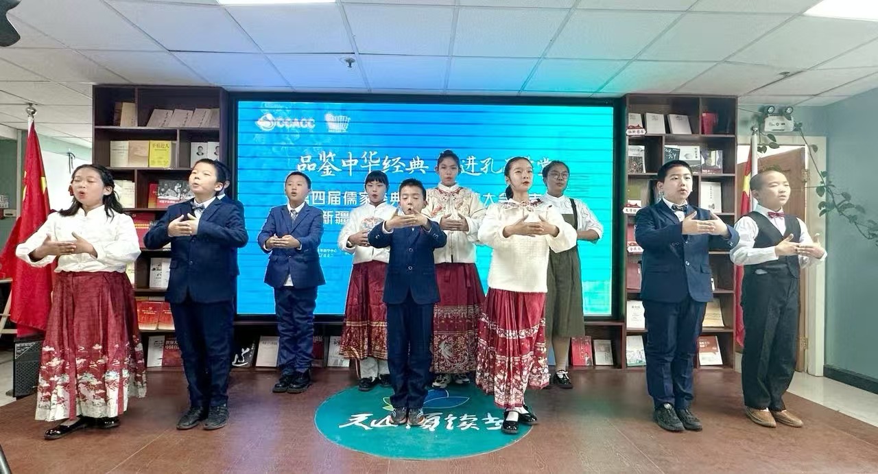 活動由何志涓主持,分為致敬儒家經典、走進孔子學堂、弘揚中華經典三個篇章,現場節目精彩紛呈,來自烏魯木齊聆音語言藝術學校的小學生采用情景演繹誦讀《論語》篇章,新疆石河子大學外國語學院的學生們以中英雙語誦讀《大學》節選,展現了儒家文化的博大精深和跨語言傳播的魅力。新疆詩詞學會、新疆楹聯家協會以及兵團詩詞楹聯家協會的會員們傾情朗誦了中國古典詩詞和天山詩派的原創作品,贏得了現場觀眾的陣陣掌聲。最后,全體參與人員共同誦讀了《論語》中的經典名句,將活動推向高潮。