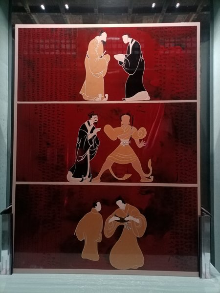 走進展廳,第一件展品是西漢海昏侯墓出土的孔子衣鏡(復制品)。衣鏡背面繪制了3組人物,其中最上一欄左為孔子,右為顏回。圖像兩側墨書內容為相應的人物傳記。這是目前所見考古出土文物中最早的孔子形象,可見漢代帝王對孔子及儒學的重視。