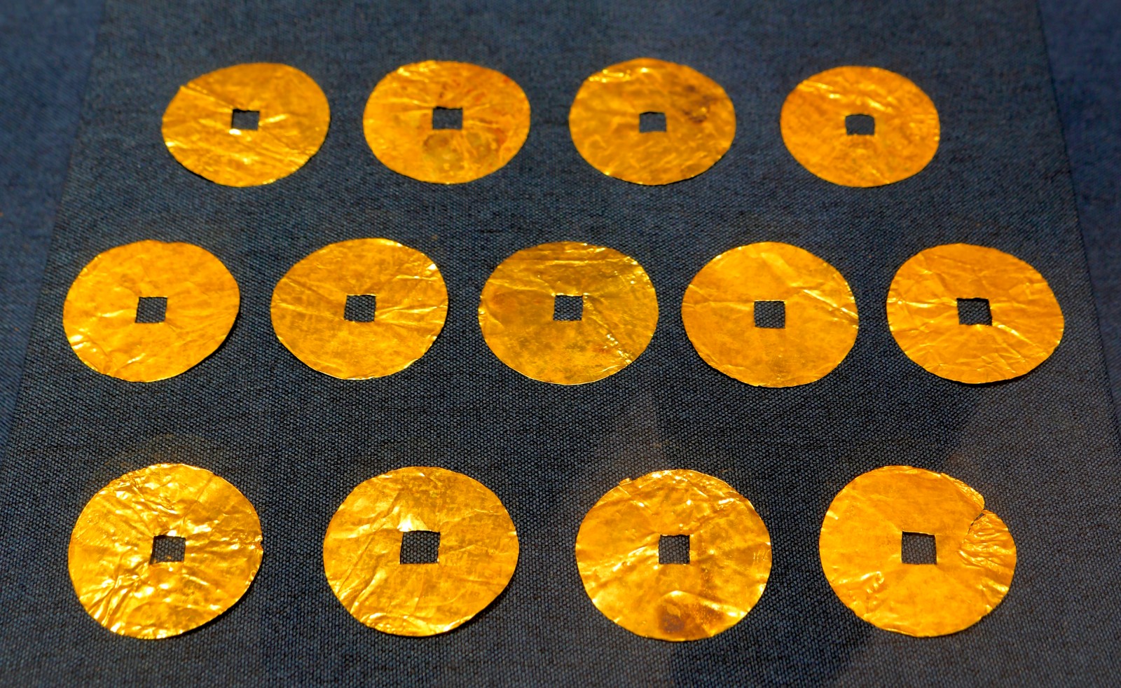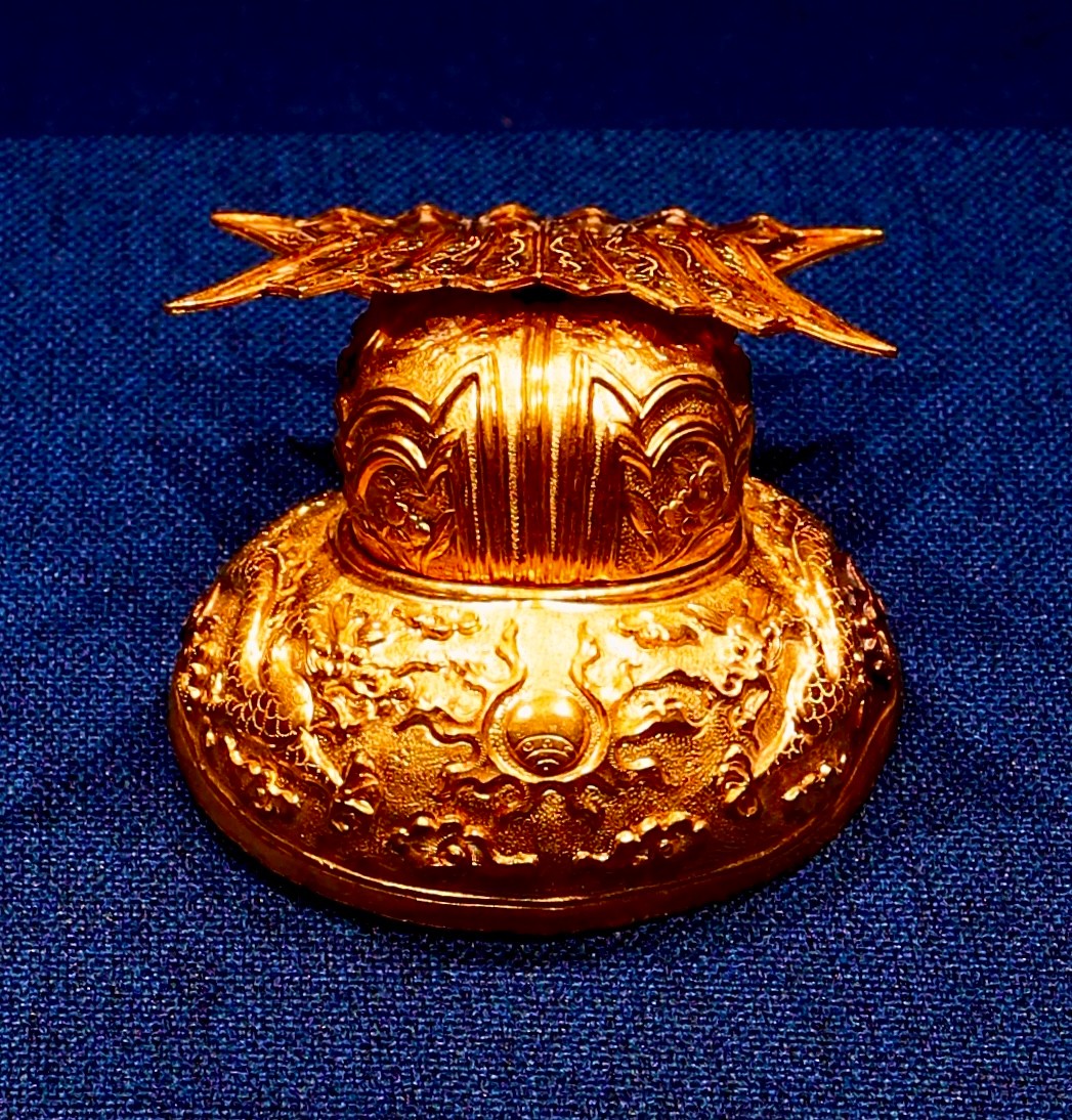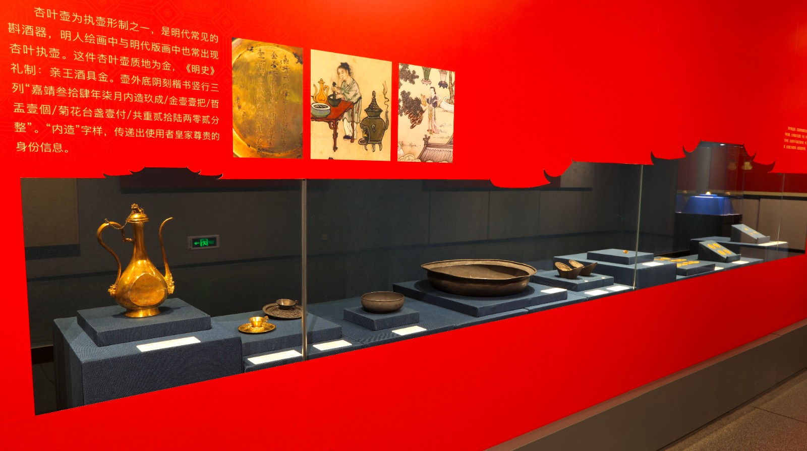 明代杏葉金壺、金盤盞、銀盂、銀盆、銀錠、金冥幣等。