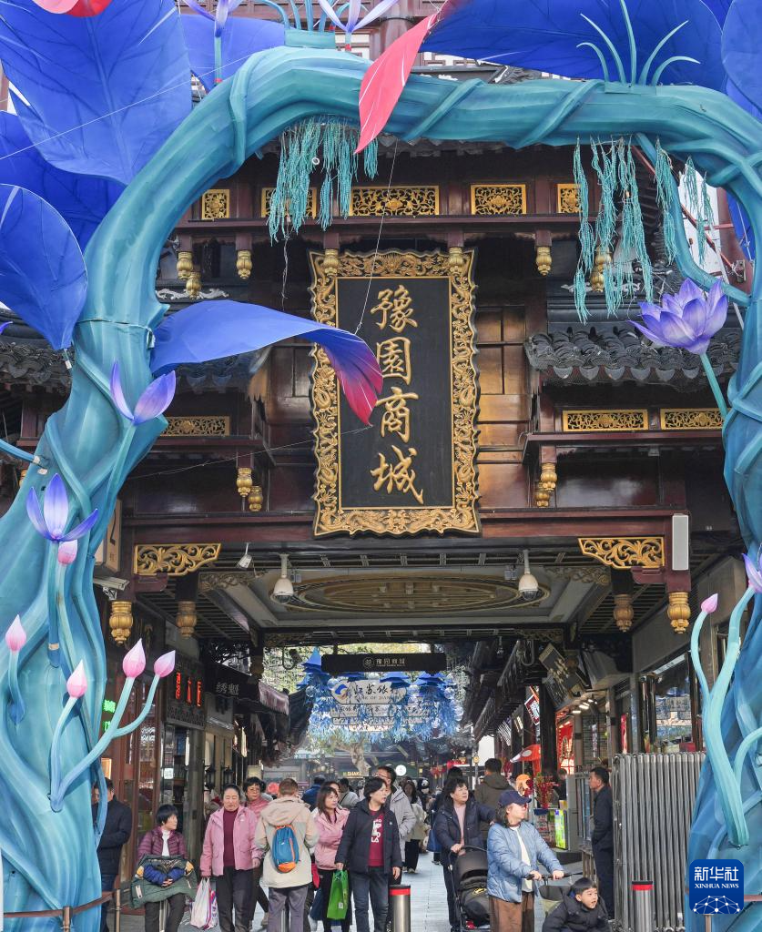 12月17日,游客在安裝了燈組的上海豫園商城凝暉路游覽。