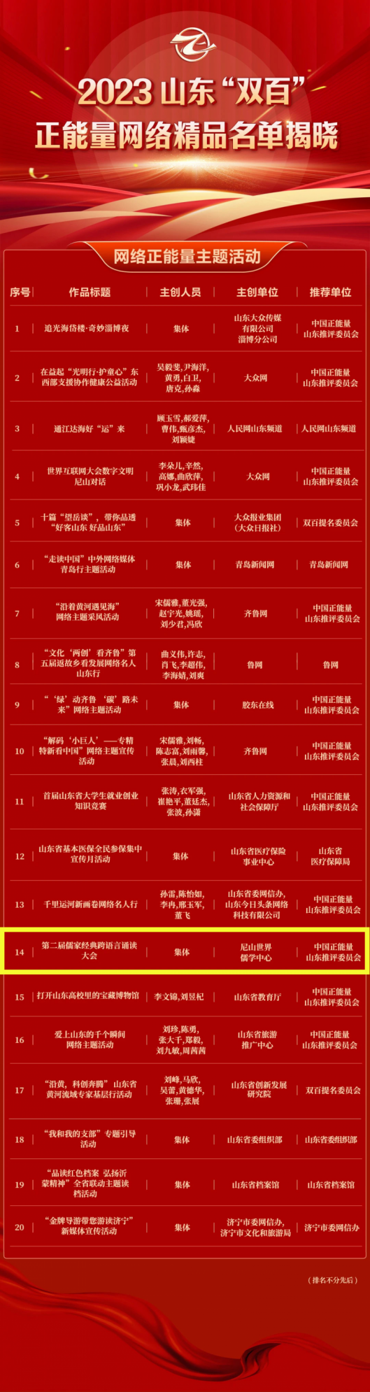 由山東省委網信辦主辦的2023山東“雙百”正能量網絡精品評選活動5月13日揭曉結果,尼山世界儒學中心報送的“第二屆儒家經典跨語言誦讀大會”活動成功入選網絡正能量主題活動。