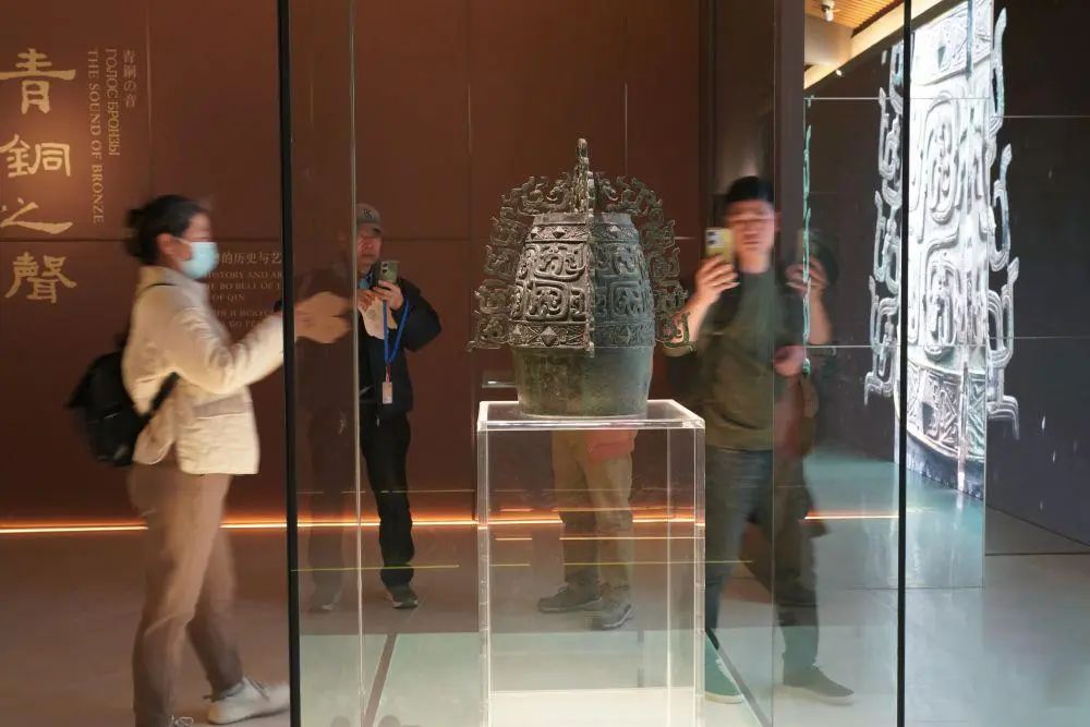 △2月26日,游客在西部機場博物館珍寶館內參觀國家一級文物“秦公镈”。