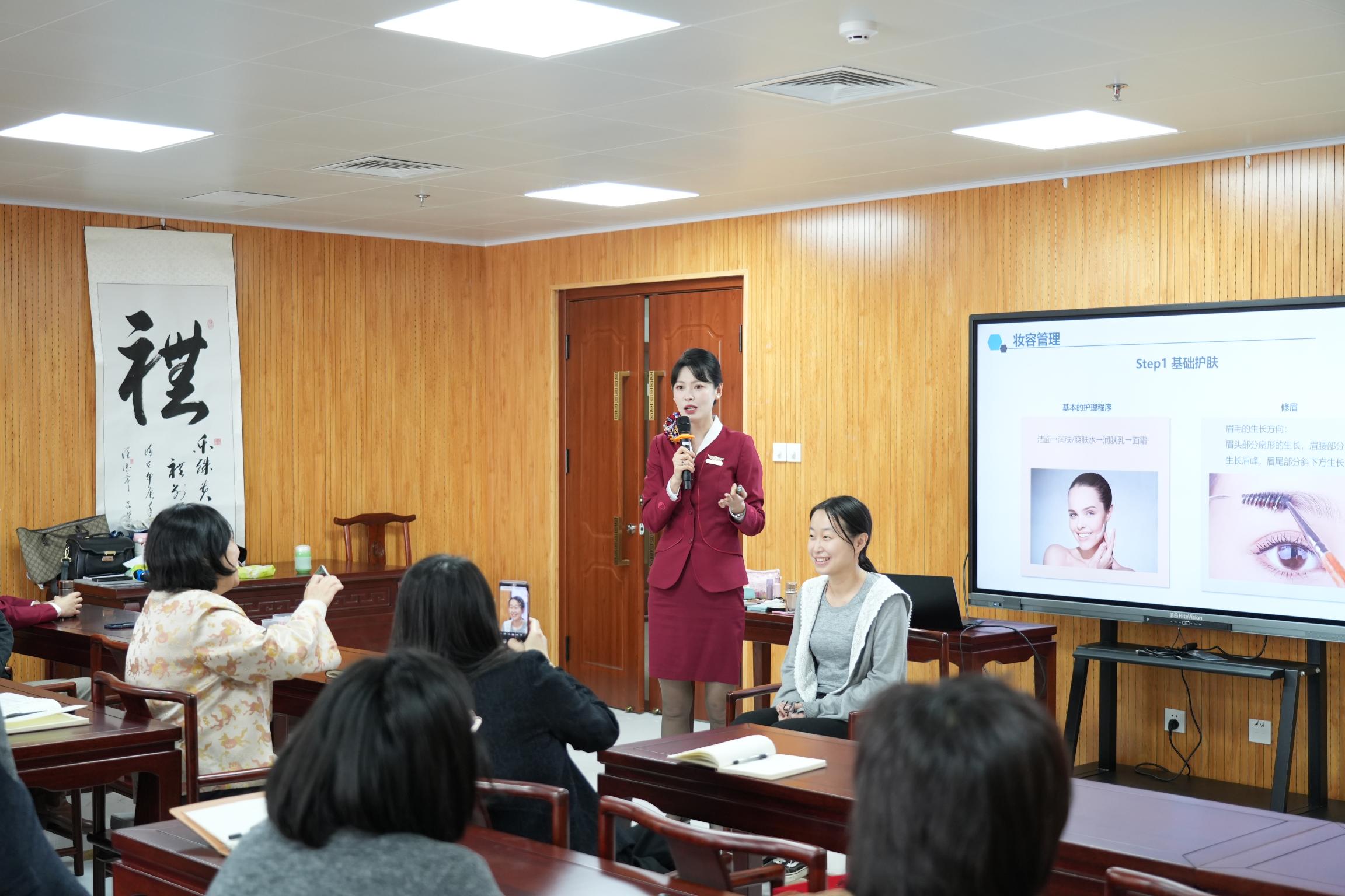 活動邀請到全球首家“空中孔子學堂”——山東航空客艙服務部乘務講師李洋、王珊珊為大家作《禮儀美學——妝容與服飾搭配》專題講座,以“展巾幗風姿 綻玫瑰芳華”為主題,從“色彩的藝術”“服飾配色”“妝容美學”等三個方面進行了生動細致的講解。婦女同志們認真聽講、積極互動,現場氣氛熱烈。