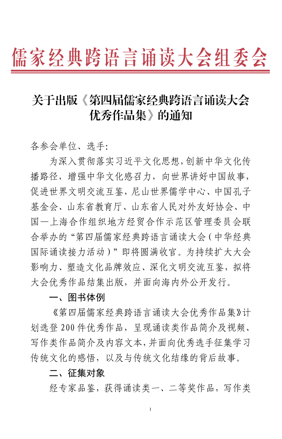 關(guān)于出版《第四屆儒家經(jīng)典跨語言誦讀大會(huì)優(yōu)秀作品集》的通知
