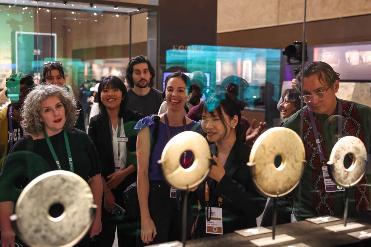 △4月23日,參加第三屆聯合國教科文組織國際博物館高級別論壇的嘉賓在參觀良渚博物院。新華社記者 江漢 攝