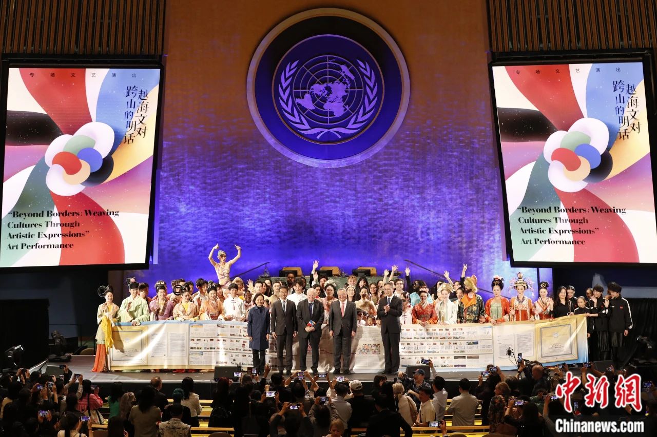當地時間2025年6月9日,中國在紐約聯合國總部舉辦“文明對話國際日”主題活動,包括主題對話會、文明交流互鑒長卷展覽以及“跨越山海的文明對話”文藝演出等活動。2025年6月10日是首個聯合國“文明對話國際日”。中新社記者 廖攀 攝