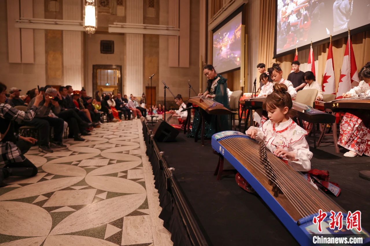當地時間2024年11月25日,洋溢著濃郁“中國風”的第四屆渥太華民樂戲曲文化節在加拿大渥太華國會禮堂舉行。圖為演員們表演箏鼓合奏《盛世國樂》。 中新社記者 余瑞冬攝