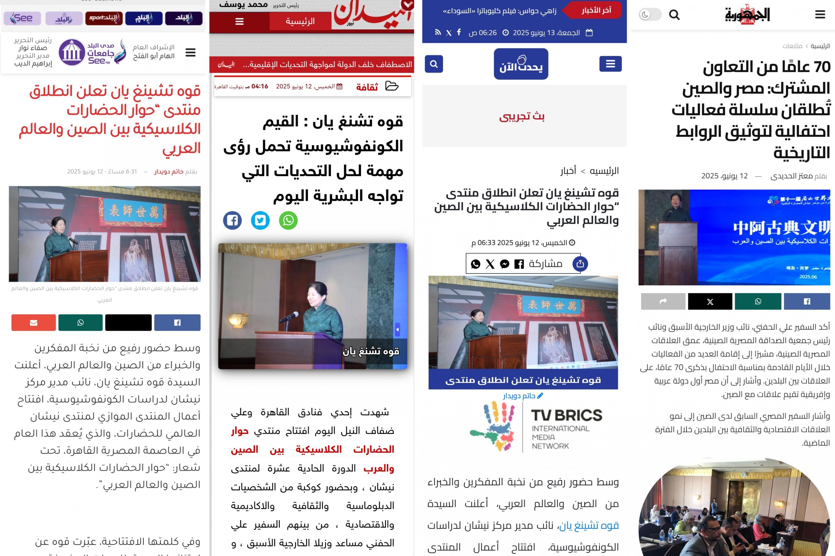 中阿古典文明對(duì)話會(huì)的舉辦受到埃及主流媒體的熱切關(guān)注?!遏斊潯び人馗!冯s志、《共和國(guó)報(bào)》《今日埃及人報(bào)》《現(xiàn)場(chǎng)》《埃及人報(bào)》《巴瓦巴網(wǎng)》《巴拉德新聞》《今日消息報(bào)》等媒體記者現(xiàn)場(chǎng)參會(huì),多角度深度報(bào)道,傳遞出對(duì)中華文明智慧與中阿務(wù)實(shí)合作的高度認(rèn)同。