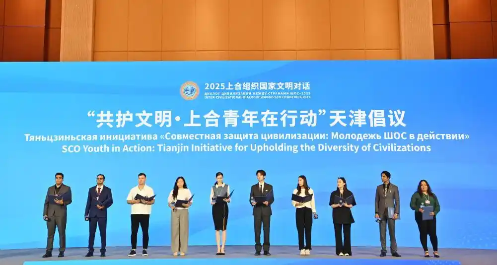 7月23日在2025上合組織國家文明對話現場拍攝的“共護文明·上合青年在行動”天津倡議發布環節。當日,由國務院新聞辦、中國外文局、上合組織秘書處聯合主辦的2025上合組織國家文明對話在天津舉行。新華社記者李然 攝