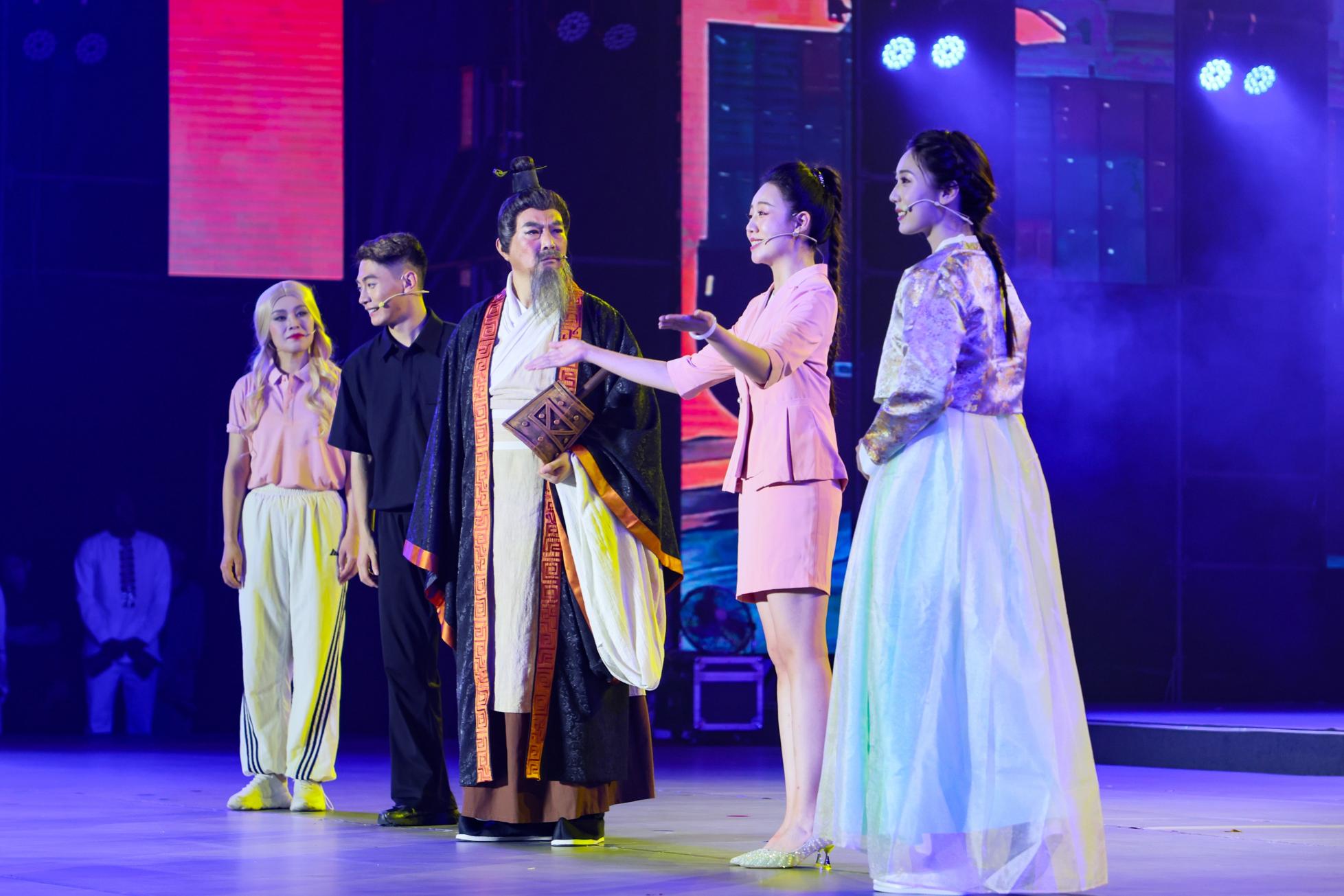 古琴雅樂與現(xiàn)代交響的跨界碰撞,悠揚(yáng)琴音與激昂樂章交織,仿佛穿越時(shí)空的對話;LED動態(tài)背景與激光投影的科技賦能,讓舞臺在春秋杏壇、大唐長安與當(dāng)代會場間自如切換,逼真而絢麗;深衣儒服的莊重典雅與中亞袍服的異域風(fēng)情相映成趣,訴說著文化的多元與包容。