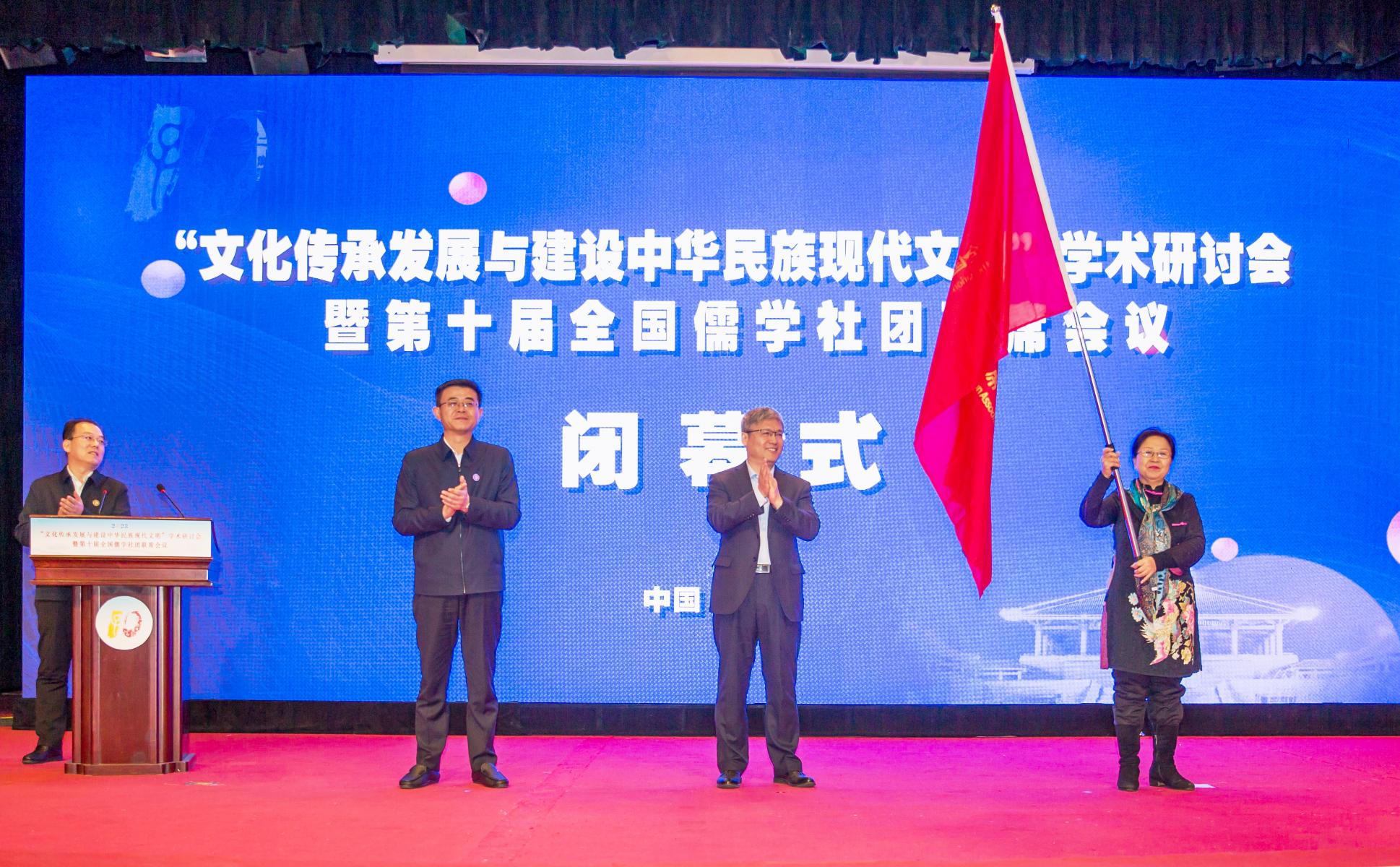 閉幕式由尼山世界儒學(xué)中心(中國孔子基金會秘書處)黨委委員、中國孔子基金會副秘書長米懷勇主持。經(jīng)會議討論通過,全國儒學(xué)社團(tuán)共同發(fā)出“曲阜倡議”,各研討組召集人依次做匯報(bào)發(fā)言。全國儒學(xué)社團(tuán)聯(lián)席會議秘書長王杰作會議總結(jié)。閉幕式上還舉行了會旗交接儀式,王杰與尼山世界儒學(xué)中心(中國孔子基金會秘書處)黨委委員、副主任,孔子研究院黨委書記朱瑞顯與黑龍江孔子研究會代表完成會旗交接,第十一屆全國儒學(xué)社團(tuán)聯(lián)席會議將在哈爾濱舉辦。全國儒學(xué)社團(tuán)聯(lián)席會議是由浙江省儒學(xué)學(xué)會、中國孔子基金會共同發(fā)起的,致力于推動儒學(xué)社團(tuán)有效開展工作的交流對話機(jī)制和交流平臺,聚焦儒學(xué)前沿問題、儒學(xué)社團(tuán)發(fā)展建設(shè)問題、文化傳承發(fā)展等,邀請全國各地優(yōu)秀儒學(xué)社團(tuán)、儒學(xué)專家學(xué)者,通過經(jīng)驗(yàn)交流、學(xué)術(shù)研討,引導(dǎo)儒學(xué)社團(tuán)健康有序地開展儒學(xué)研究闡釋、傳承發(fā)展、傳播普及工作,為助推建設(shè)社會主義現(xiàn)代化文化強(qiáng)國貢獻(xiàn)智慧力量。