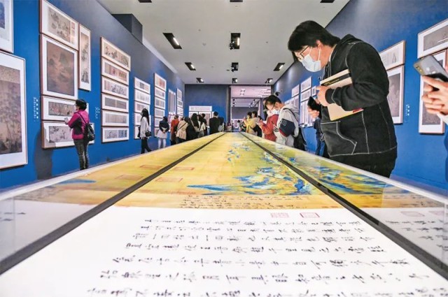 文化遺產中,有萬千氣象、民族自信。中國國家博物館展出的“盛世修典——‘中國歷代繪畫大系’成果展”,將穿越千年的丹青、散落全球的國寶通過高清打樣圖像匯聚一堂。圖為2022年10月26日,觀眾在欣賞多媒體版的《千里江山圖》燈光特效圖。 視覺中國供圖